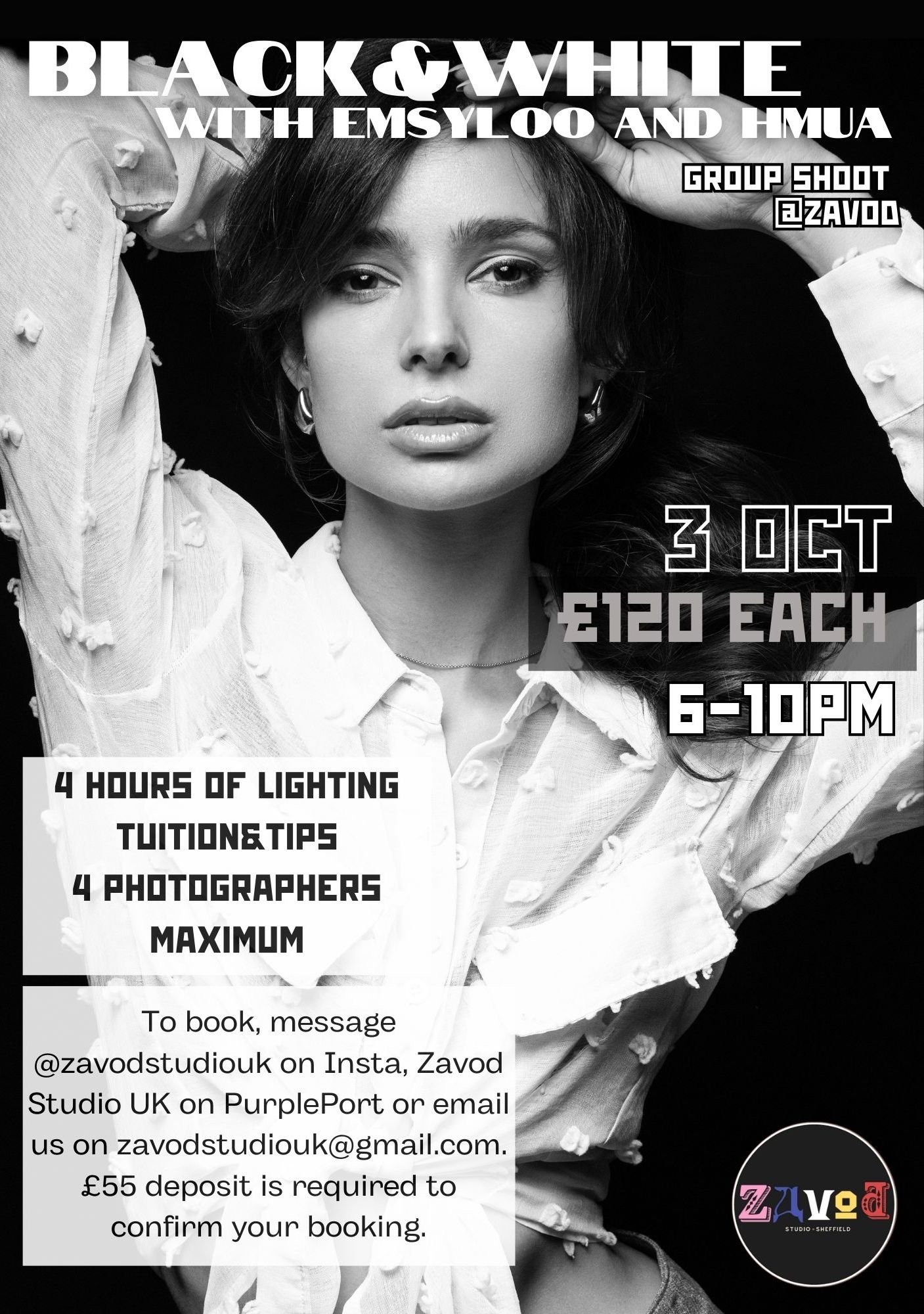 A new Zavod group shoot event is a timeless classic. Black&White will feature a professional London model Emsyloo and Sheffield’s best makeup and hair artist Alona Dmytrenko. 4 spaces are open to the photographers who want to explore different photography techniques and grab some beautiful images for their portfolio along the way.